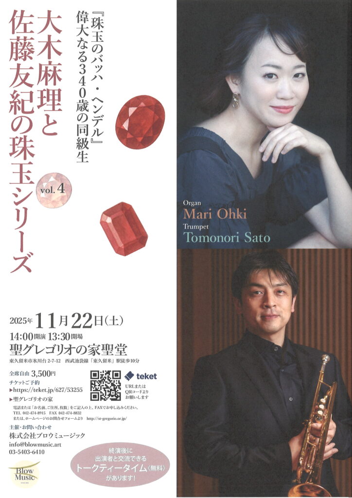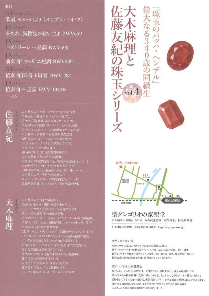聖グレゴリオの家のオルガンゼミナールの講師の一人、大木麻理さんとトランペットの佐藤友紀さんによる聖グレゴリオの家でのコンサート「大木麻理と佐藤知紀の珠玉シリーズ」は、今回が第4回目となりました「珠玉のバッハ・ヘンデル」~偉大なる340歳の同級生~です。