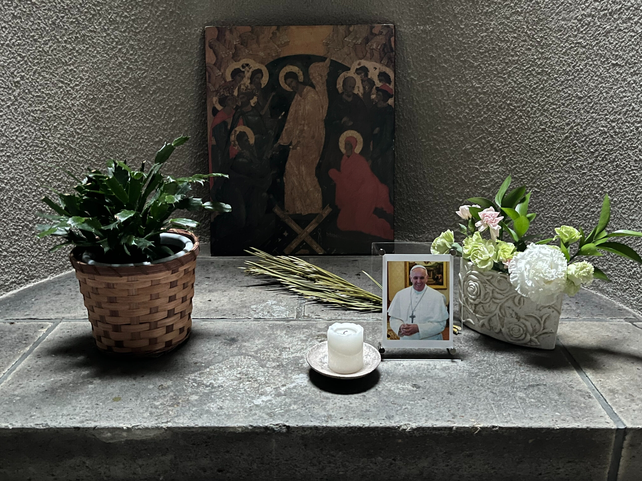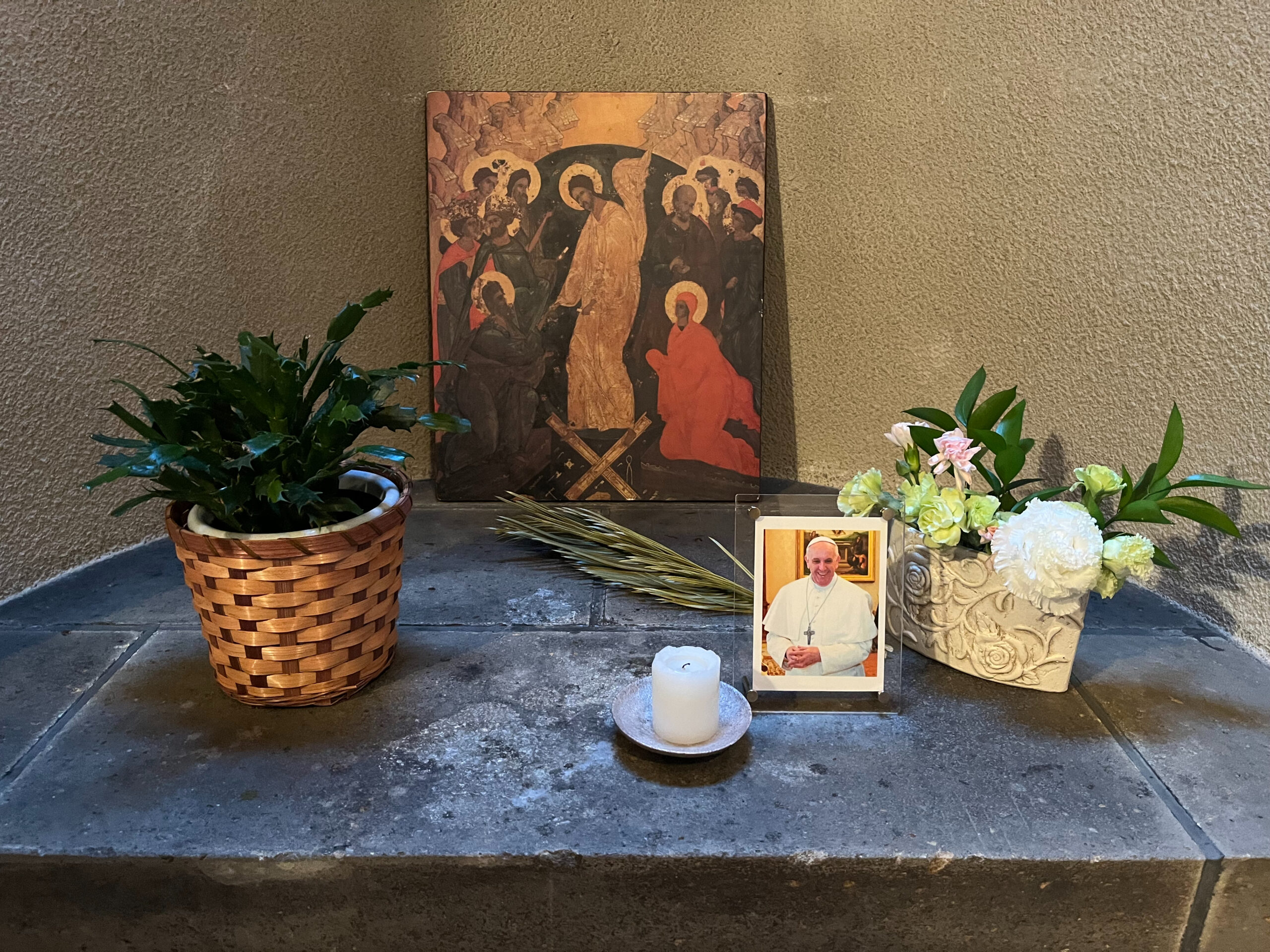 イースターの翌日4月21日に帰天されたフランチェスコ教皇の遺影を置きました。そして、5月7日からバチカン・システィーナ礼拝堂でコンクラーベが始まり、新教皇が選出される運びとなります。これからの世界を守り、聖霊による一致と導き、キリストの平和を祈ります。
