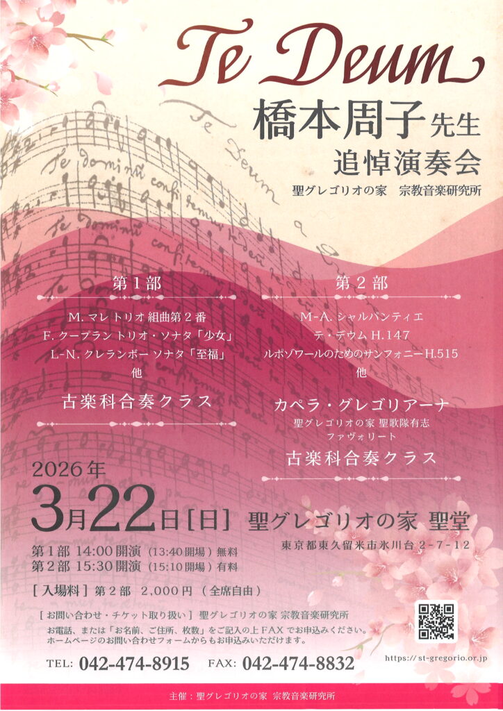 【お知らせ】橋本周子先生追悼演奏会 Te Deum(3/22)