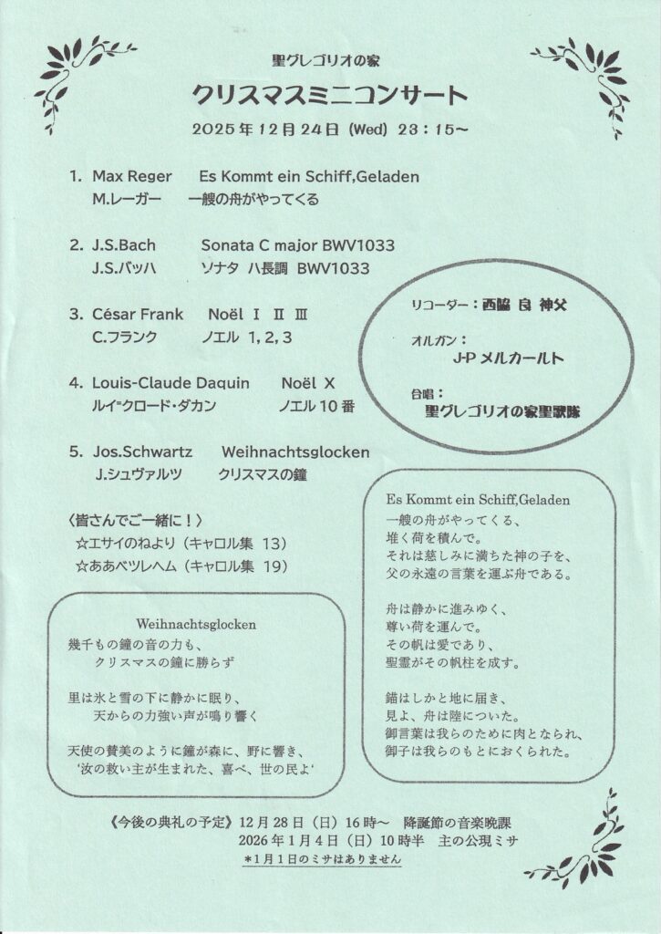 出演者は、リコーダー:西脇良、オルガン:J-P. メルカールト、合唱:聖グレゴリオの家聖歌隊