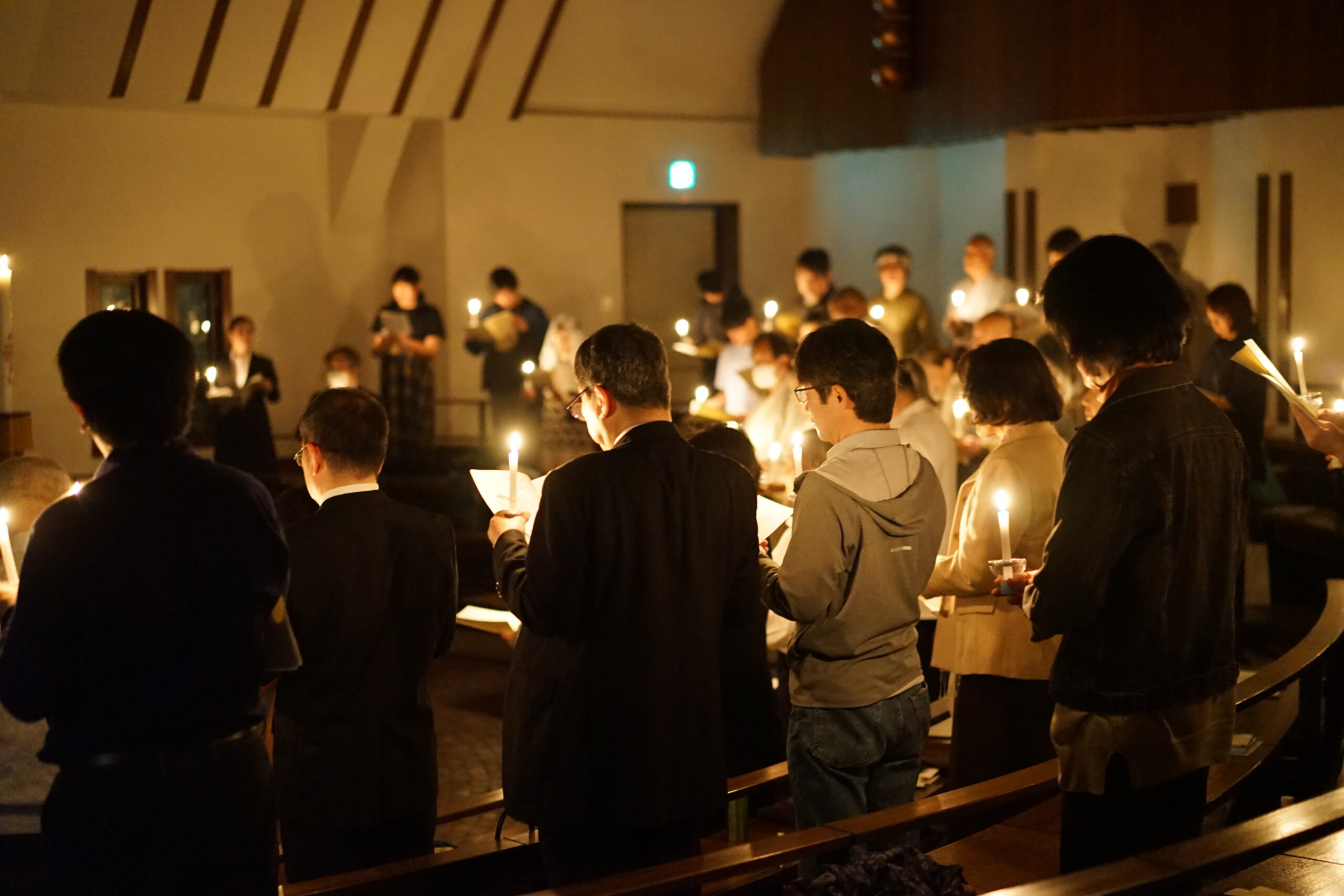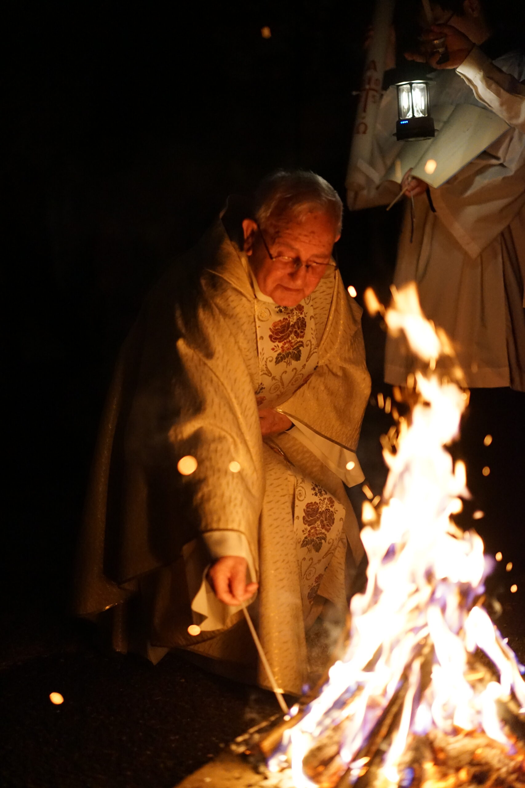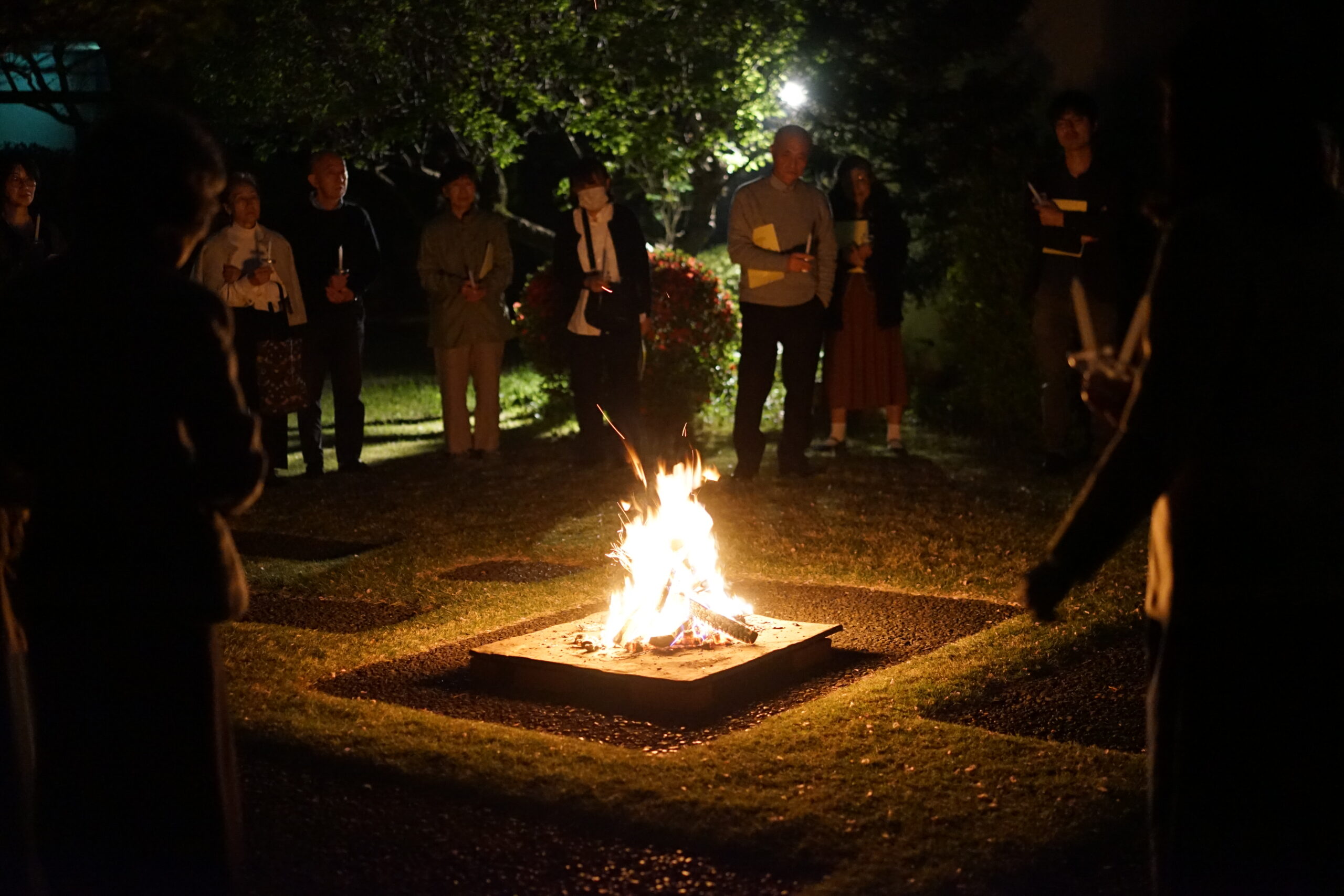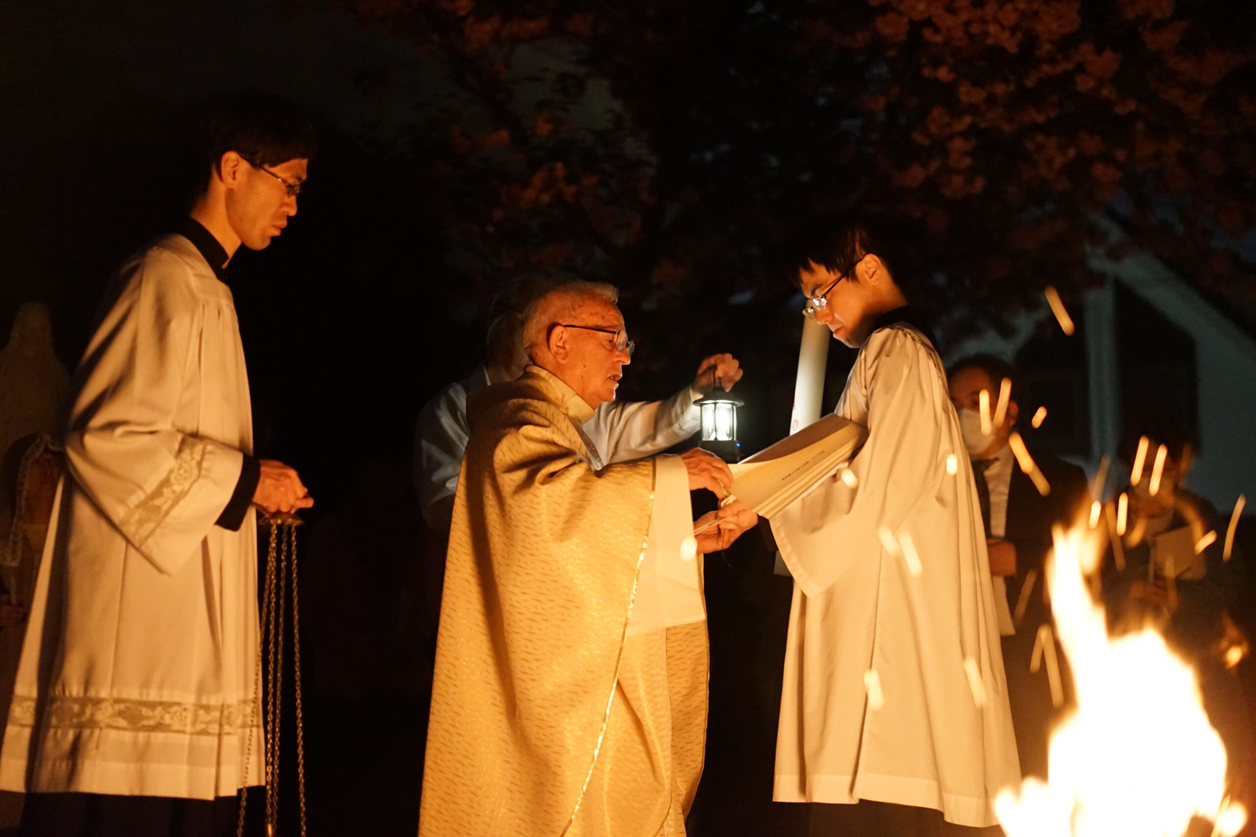 火打石で発火した火をもとに、庭に配置した燃やし、一人ひとりがロウソクの灯をもって聖堂に移動し、荘厳な雰囲気のなかでミサを執り行うことができました。アレルヤ