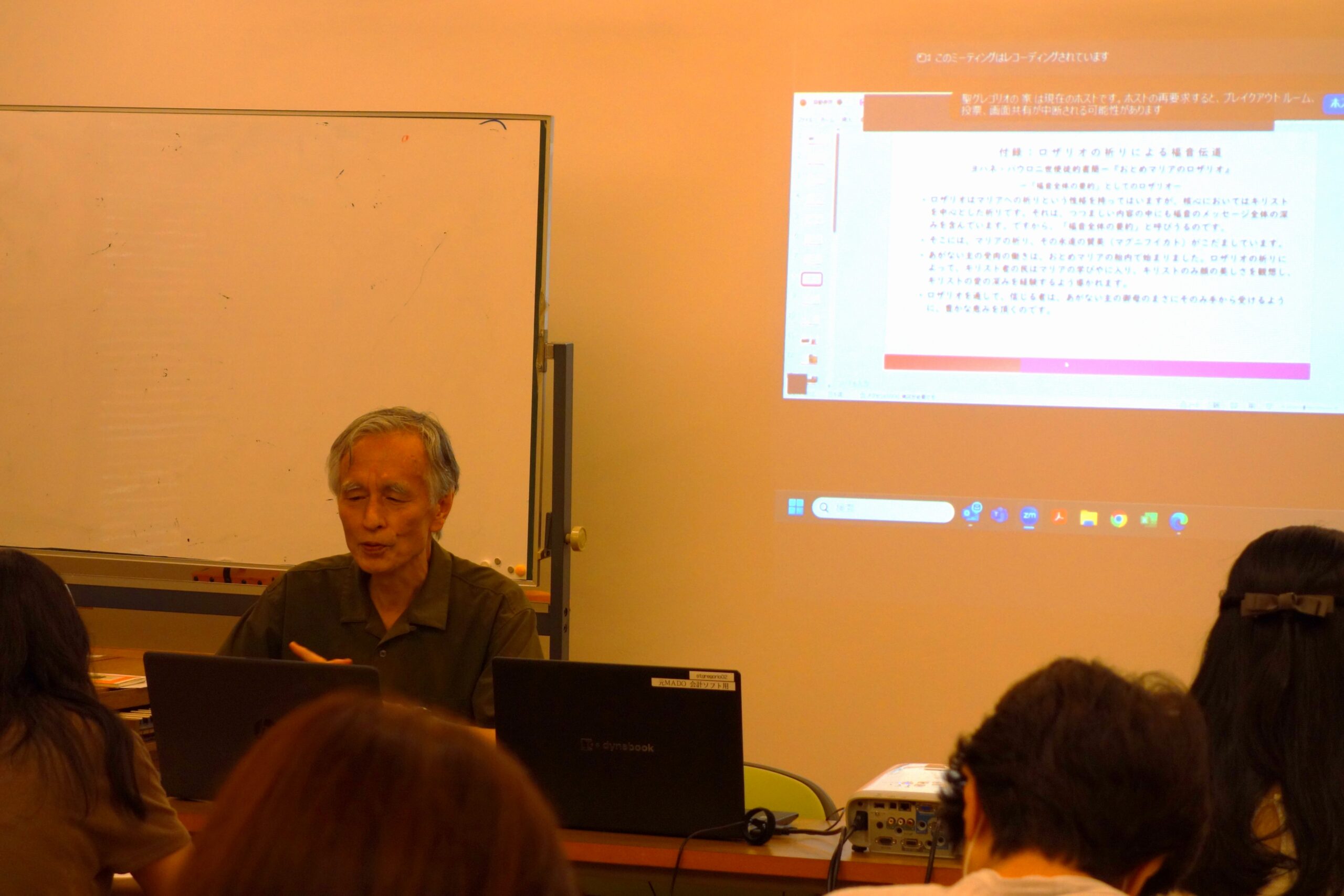 春学期の最後の授業では、教会典礼と福音伝道の精神をよりよく理解するために、ヨハネ・パウロ二世の使徒的書簡、「乙女マリアのロザリオ」をとりあげ、聖母と共にキリストの生涯を黙想するカトリック教会の伝統の意味を再考しました。日本におけるミサ典礼の歴史は、古くはキリシタン時代に遡りますが、当時の霊性の書である「スピリチュアル修行(霊操)」におけるロザリオの祈りとその「神秘(玄義)」の黙想を見ると、聖母や諸聖人に対する崇敬が福音伝道の目的と深く結ばれていたことが分かります。